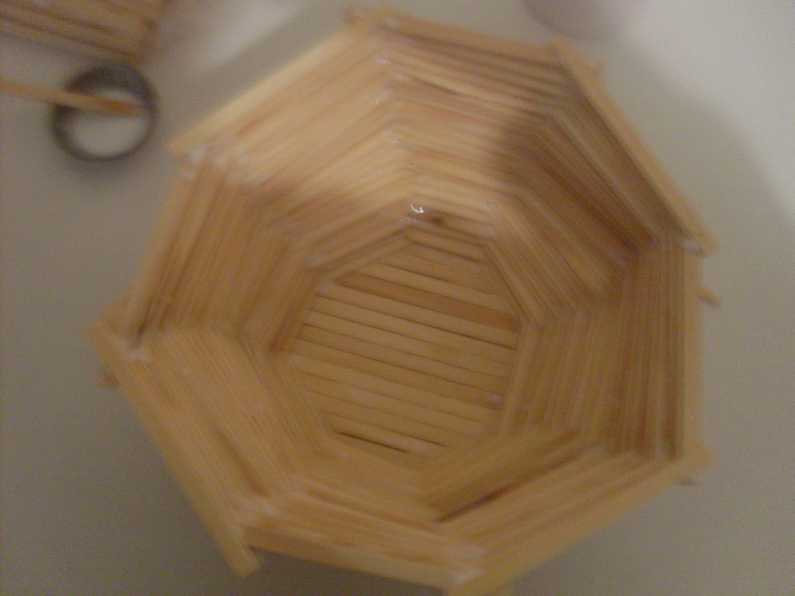 Depois q secar toda cola, vire a base. Agora temos q forrar o buraco da base, e para isso , vá colando , palitos na primeira camada q vc fez , de forma q forre o buraco , aconselho colar duas camadas de palitos , uma sobre a outra , para ficar mais resistente sua fruteira, olhe a base pronta ai:
