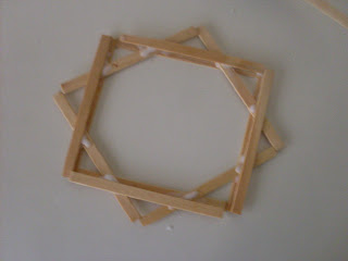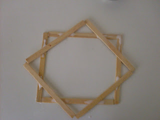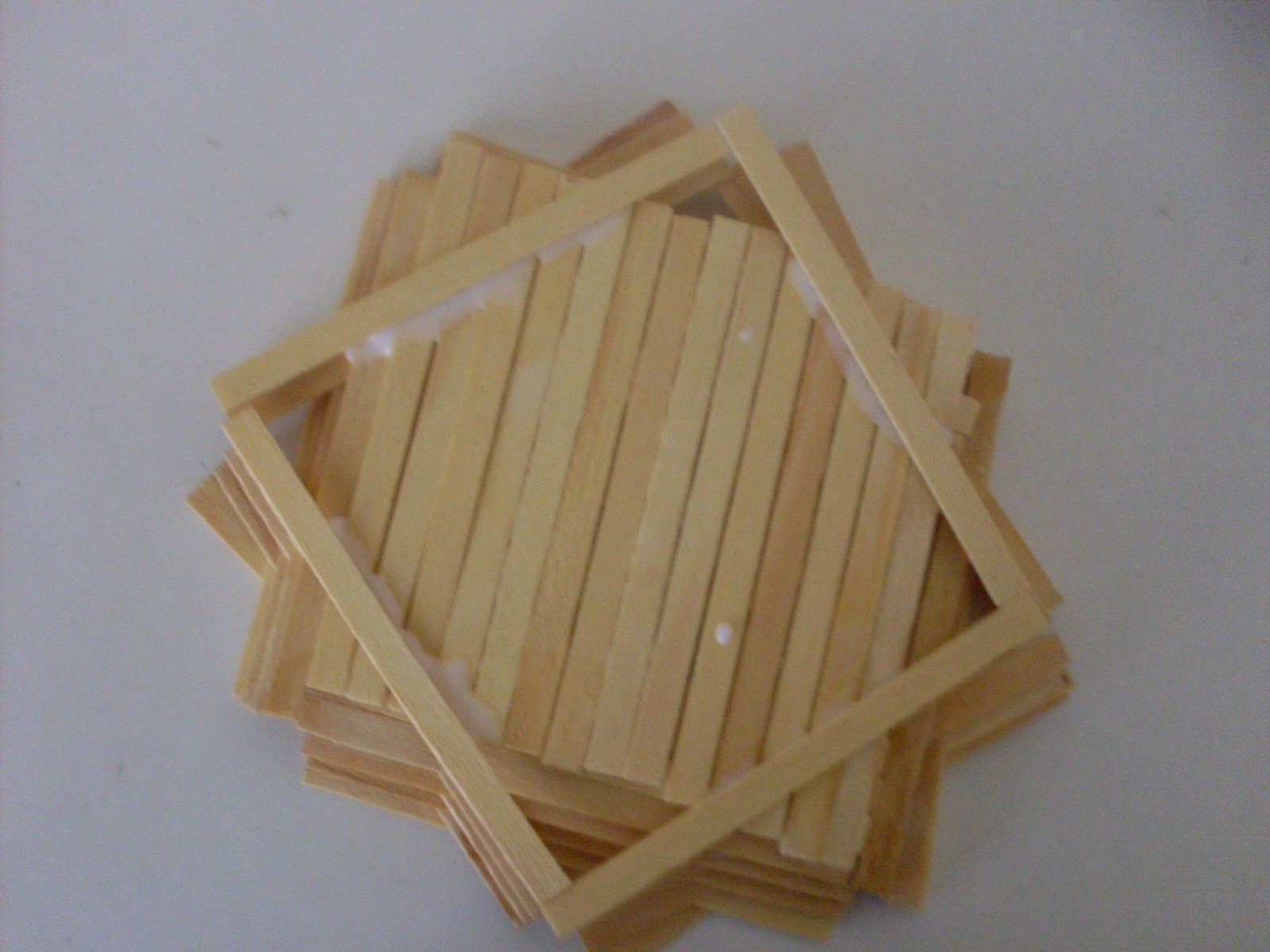 Agora cole mais 4 palitos , na mesma posição dos palitos da primeira camada , só q esses palitos da terceira camada , devem ficar com apenas a metade deles em cima da primeira camada , de forma q a terceira camada fique maior q o da primeira.