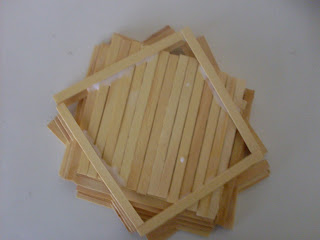 Continue colando mais palitos , mais sempre com os palitos de cima estando com apenas a metade deles em cima dos de baixo. Após ter colado 8 camadas de palitos , ou seja , 4 camadas em uma posição e 4 em outra posição , a sua base está quase pronta , não precisando mais colar nenhuma camada.Ai vai ficar assim :
